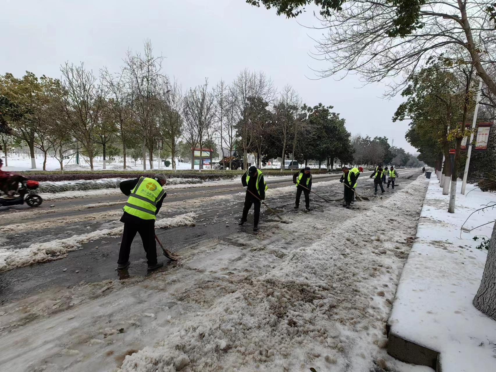 近日,我市迎来持续低温天气,连日冻雨和降雪导致道路湿滑、路面积雪严重,给广大市民安全出行带来了诸多不便。QY千亿球友会秉承“雪情就是命令”的精神,以雪为令,迅速执行应急预案,组织机械10台,集结党员干部60余名,携带铁锹、扫帚等工具来到东荆大道曹禺路至刘杨路一线,有序开展道路积雪积冰清理。