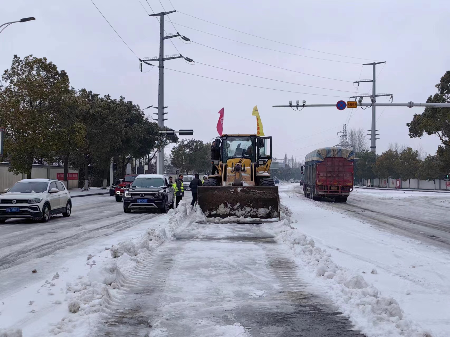 随着路面中央积雪被破开,公司又积极调动专业除雪车5台,撒布融雪剂3吨,人机协同配合,全力消除冰雪天气带来的出行安全隐患,为群众出行创造安全畅通的路面环境。
